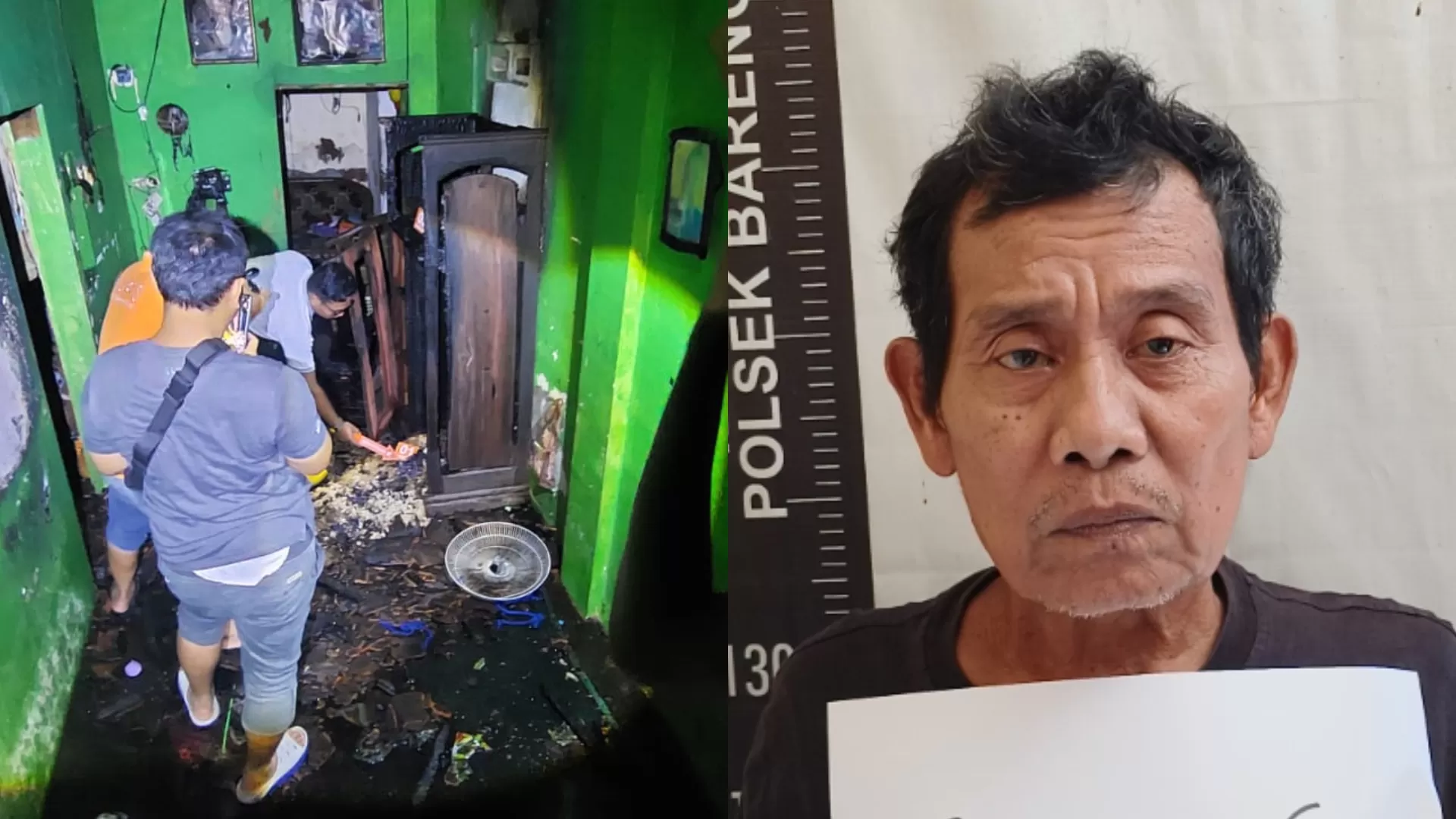 Kondisi rumah yang dibakar pelaku (kiri) dan pelaku pembakaran rumah di Bareng Jombang saat dibekuk polisi